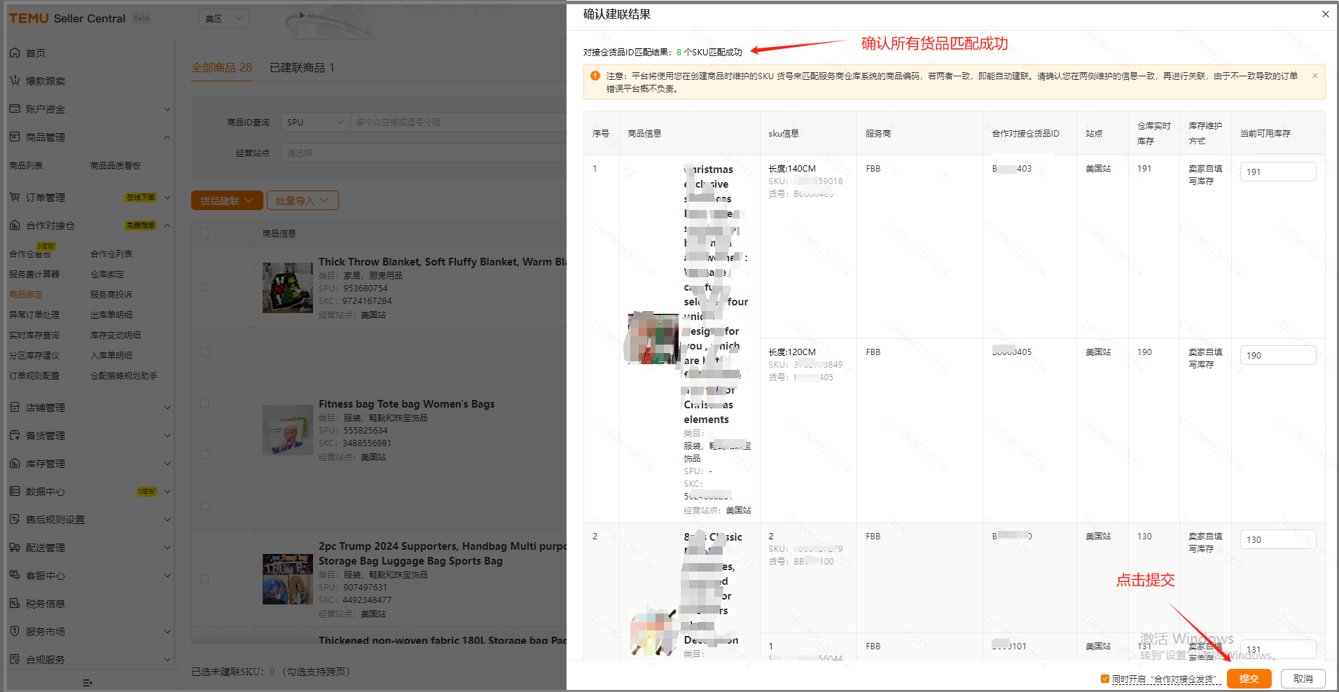请注意平台将使用您在创建商品时的货号来匹配服务商仓库系统的产品ID,若两者一致,即能自动匹配货品,无需您手动绑定。若不一致,手动绑定一下即可,如下图: